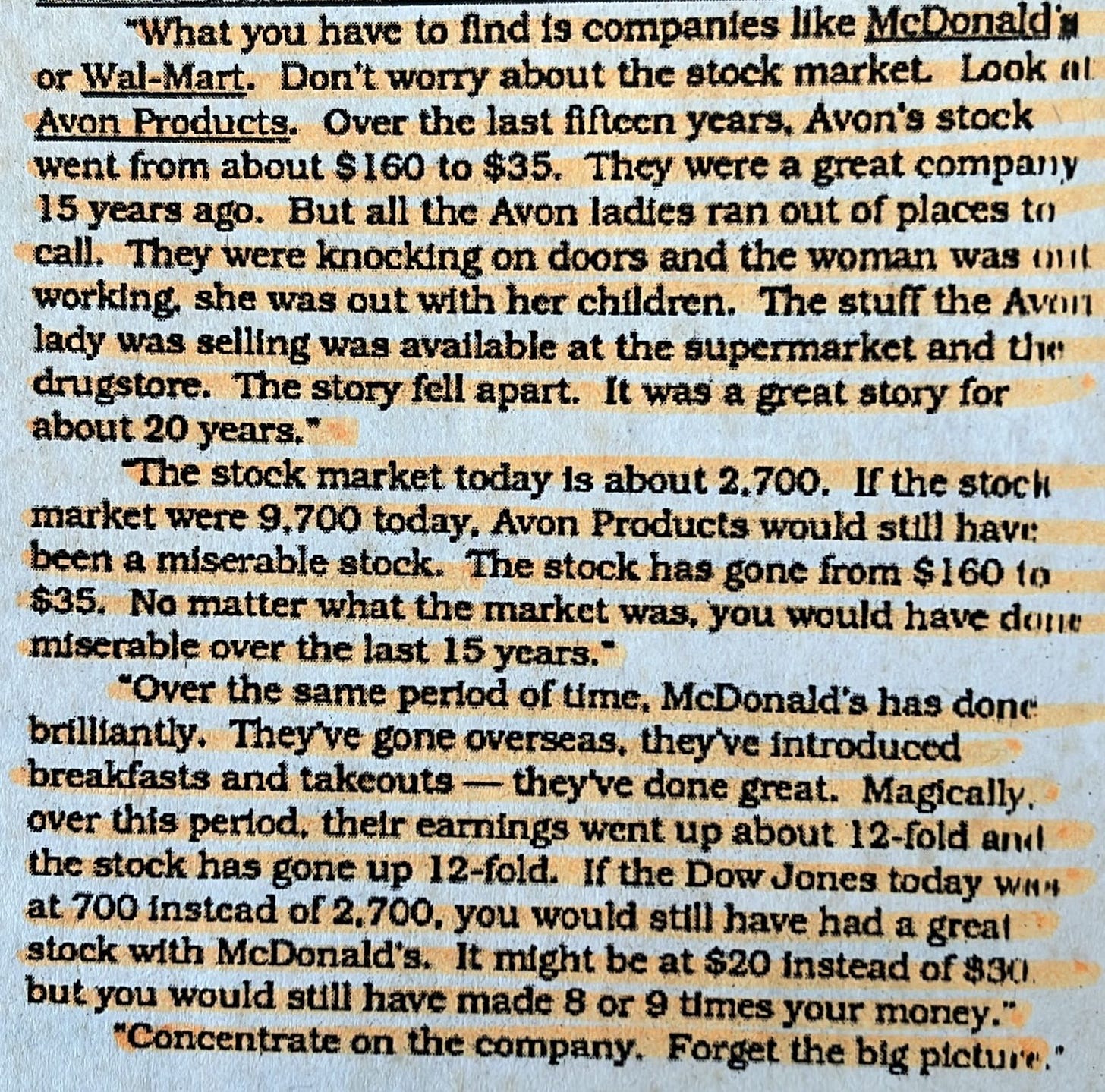 Forget the big picture. Concentrate on what happens to the company (comment made by Peter Lynch in May 1990)